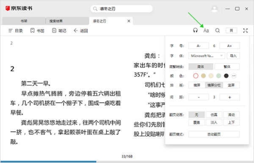 用户还可以点击如下图绿色箭头所指的图标对阅读的文本大小、字体样式、字体颜色等进行设置