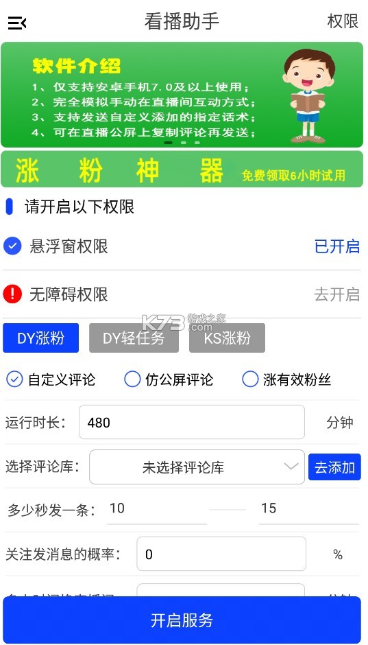 《看播助手》是一款适用于安卓系统的涨粉工具,专为直播间设计的辅助软件。它能够实现直播间的自动化操作,让你无需手动干预,使直播过程变得更加简单轻松。这款工具提供免费试用的机会,您可以先体验一下,后续根据使用情况决定是否继续使用。