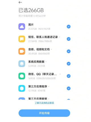 ②小米手机传其他厂商手机,只可导入照片、联系人、短信等,如需要微信或其他聊天记录,需要单独进行二次传输。