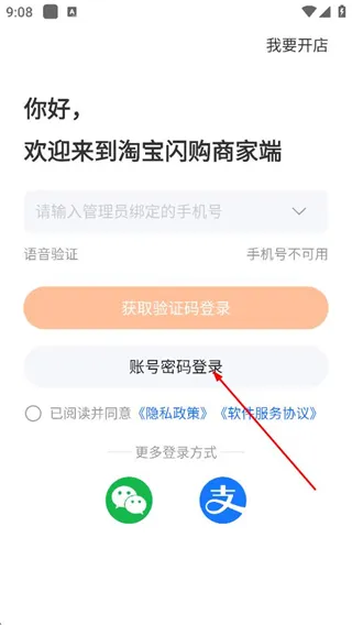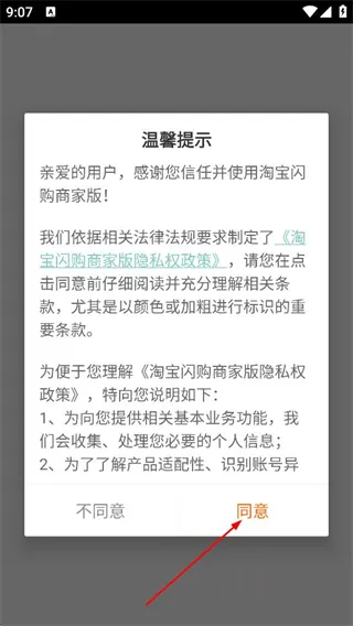 1、在淘宝闪购的温馨提示弹窗中,点击同意,进入登录页面。