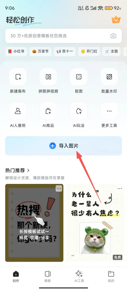 1、打开稿定设计后,我们既可以点击【导入图片】,也能选择【新建画布】【抠图】等功能,从而开启设计创作的旅程。