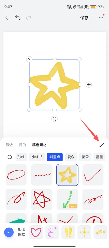 在素材栏里,大家能挑选【稿定素材】中的各类元素,像【星星】素材就很合适,选好之后点击对勾就能完成添加啦。