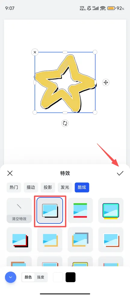 3、添加完素材后,我们可以到【特效】栏里挑选【酷炫】这类风格的特效,应用好之后点击对勾完成确认,这样能让设计效果更加出彩呢。