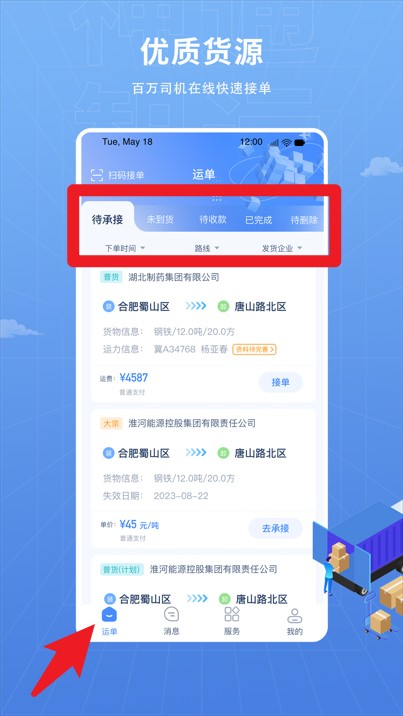 2、进入“运单”界面后,能够查看待承接、已到货等不同状态的订单,同时该界面支持订单筛选与接单操作。