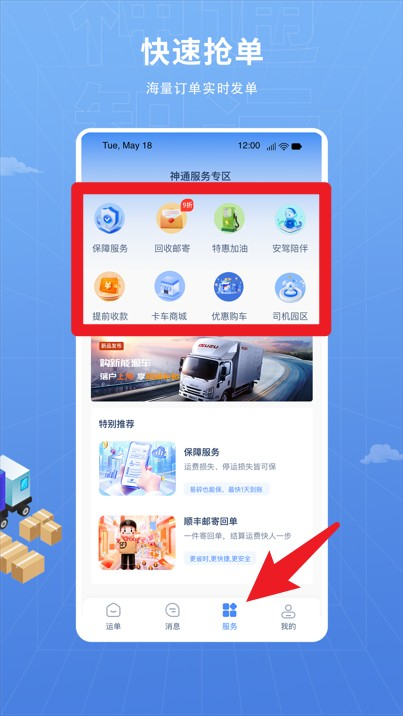 3、点击底部的“服务”按钮进入服务专区,这里提供保险、油卡、回收货等多项实用功能供选择。