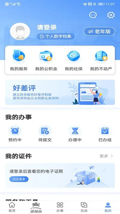 6、我的,为用户提供专属的,便捷的个性化服务。我的办事、我的证件、我的账户、我的缴费等相关内容。