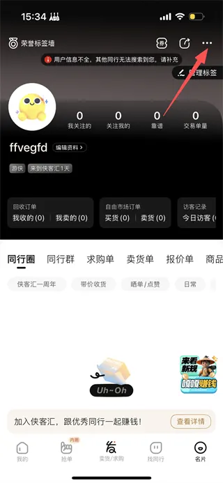 1、在侠客汇首页,点击右下角名片选项,进入个人名片页面。