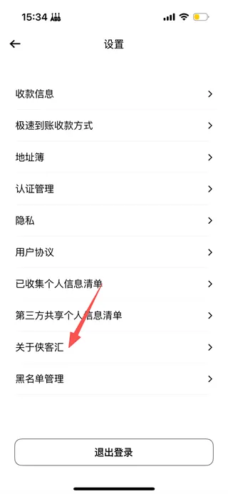 3、在设置页面,点击关于侠客汇选项,进入关于侠客汇页面。