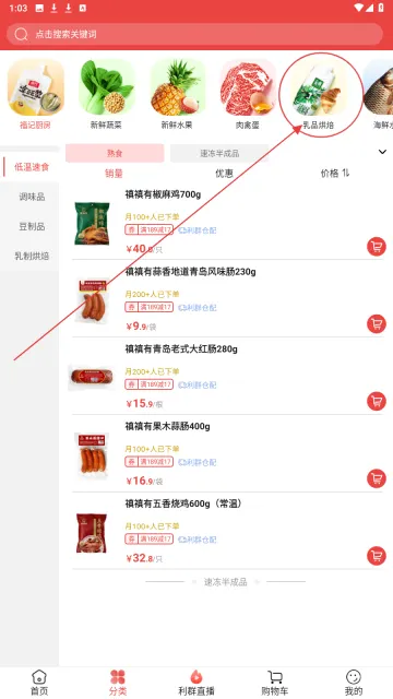 2、在分类页选【乳品烘焙】,进入对应商品专区,可挑选相关商品。