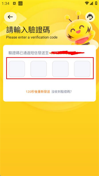 4、在短信验证码输入页面的输入框内填写收到的验证码,以此完成账号登录流程。