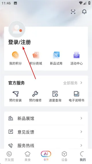 2、在个人中心页面,点击登录注册区域,进入登录页面。
