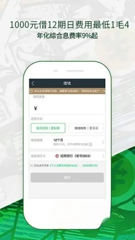 借1000元分12期还款,每日息费最低1毛4,年化综合息费率9%起(具体以实际审核结果为准)。