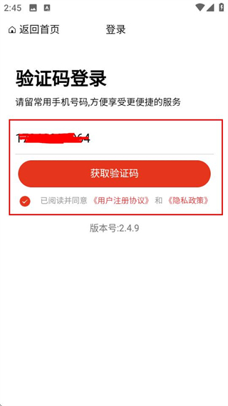 3、在验证码登录页面,填写手机号并勾选协议后,点击获取验证码。