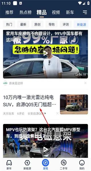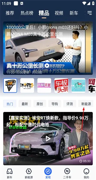 2、进入精品页面,查看各类汽车相关内容,浏览新能源分类下的资讯信息。