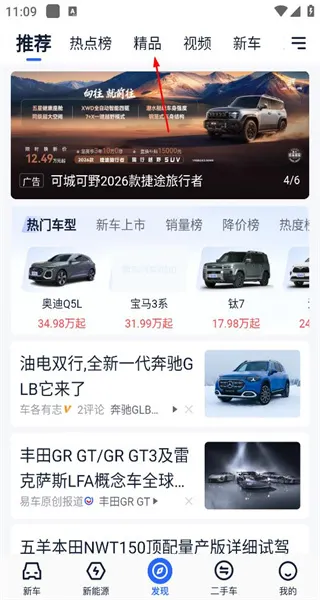 1、打开软件后,进入推荐页面,浏览热门车型,点击精品选项切换至对应内容页面。