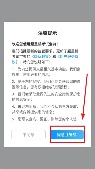 先安装起重机考试宝典应用,打开后在温馨提示界面点击同意并继续。