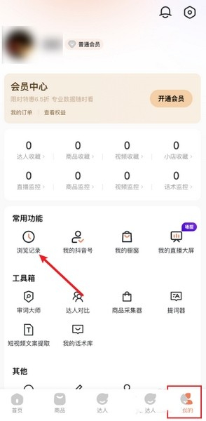 1. 打开蝉妈妈应用,进入“我的”页面,在常用功能区域找到并点击“浏览记录”选项。