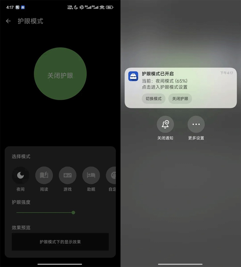 手机是否了护眼模式?就算有也是不够用的,所以我给大伙添加了一个护眼模式,支持多种模式,让你夜间看手机更舒服