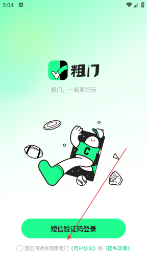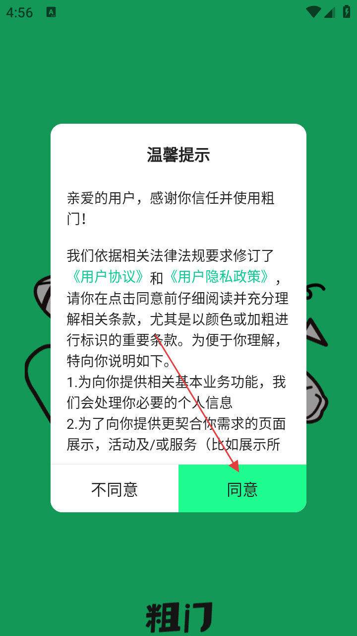 1、首次打开粗门应用,在温馨提示弹窗点【同意】,进入应用。