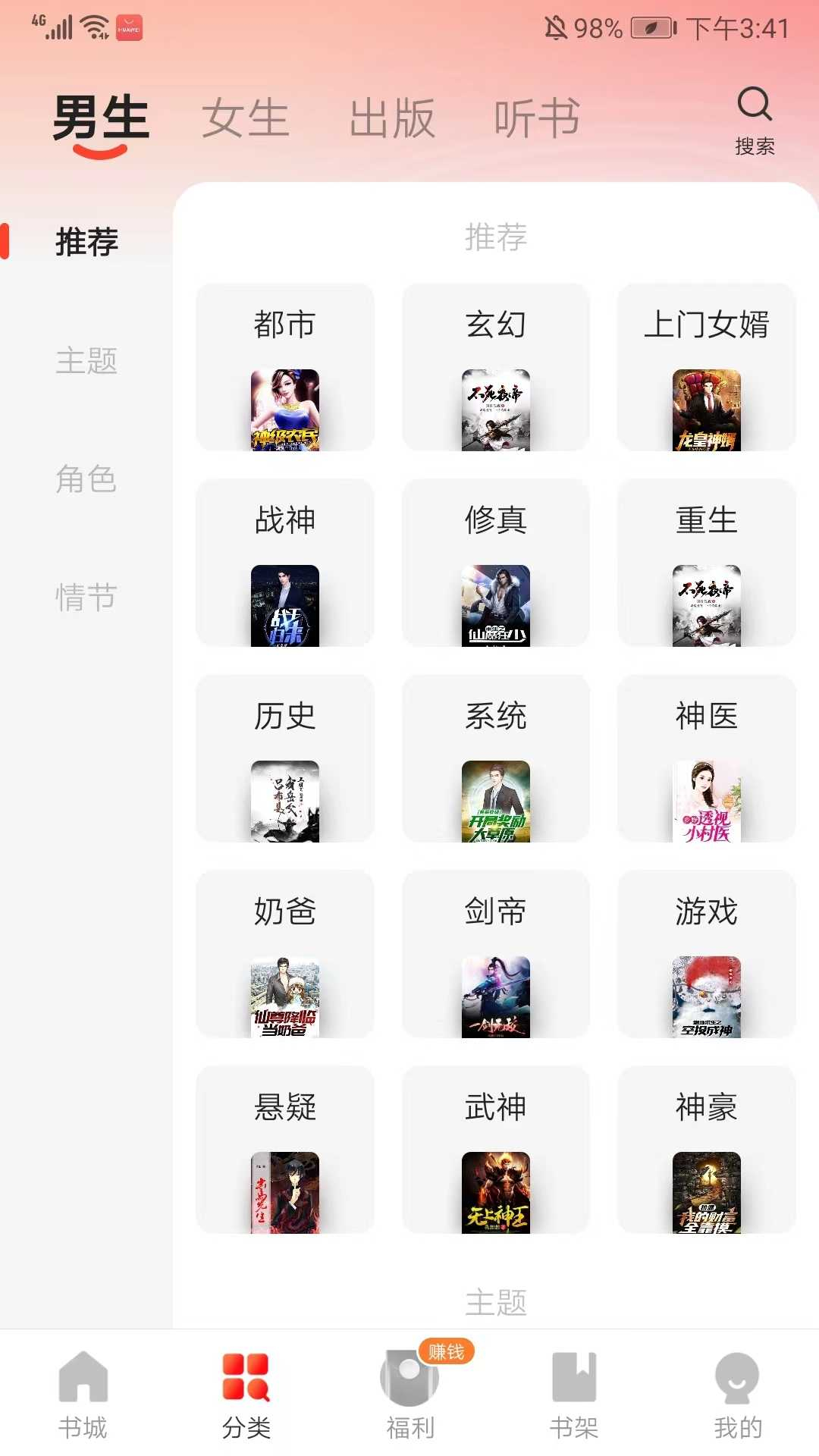 8.进入分类界面,包括推荐、主题、角色、情节等不同的类别