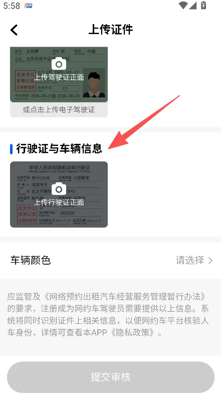 2、进入上传证件环节,分别上传驾驶证正面、行驶证正面。