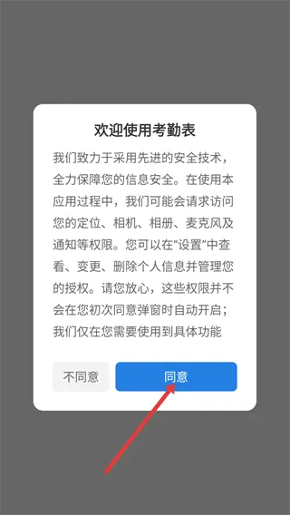 1、打开应用后,首先会看到【欢迎使用考勤表】的提示,应用会借助【安全技术】来保障信息安全,后续可能会请求多项必要的权限。