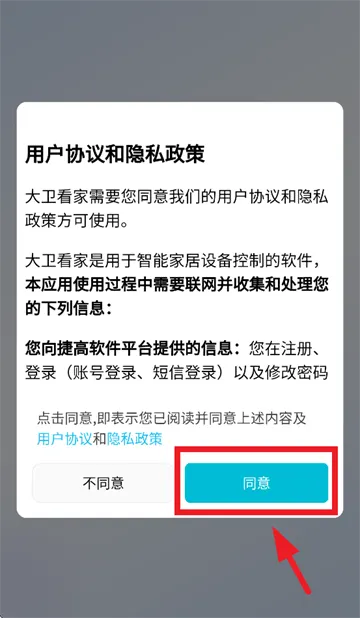 安装并打开大卫看家,先同意用户协议和隐私政策