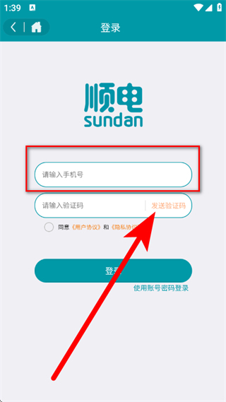 3、在登录页面,输入手机号,点击发送验证码。