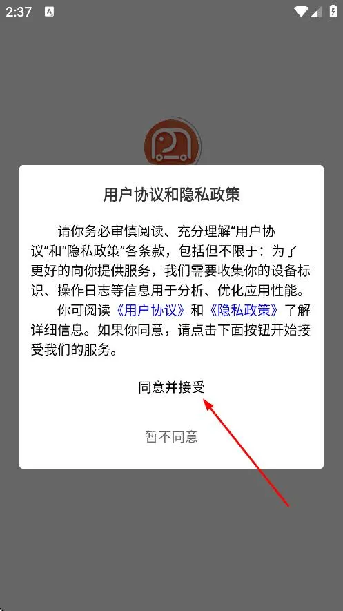 1、在用户协议和隐私政策弹窗中,点击同意并接受,进入应用首页。
