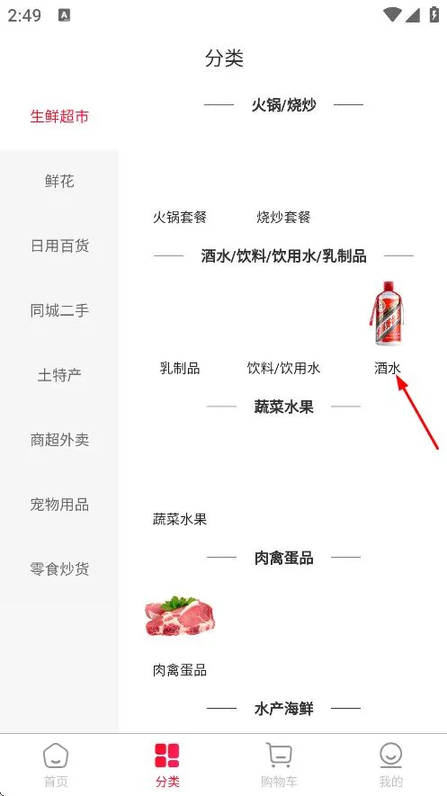 3、在分类页面,点击酒水,进入酒水商品列表页面。