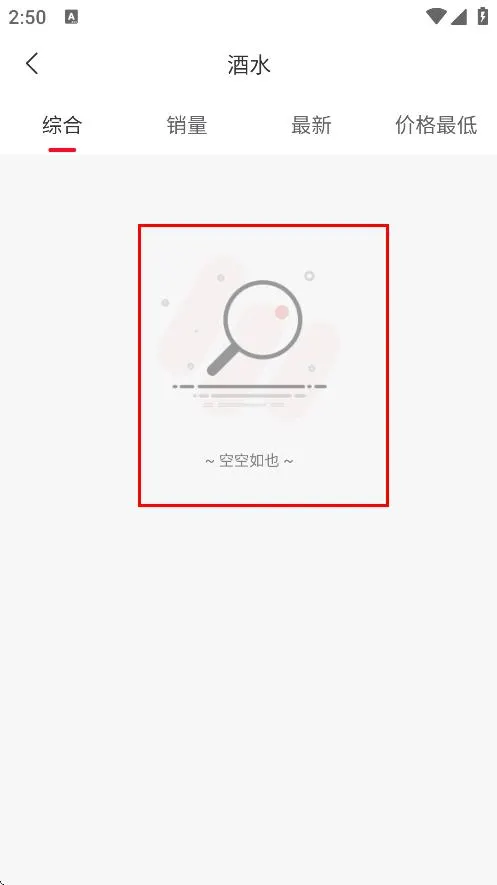 4、在酒水商品列表页面,可查看酒水类商品,当前显示空空如也,表示暂无酒水商品。
