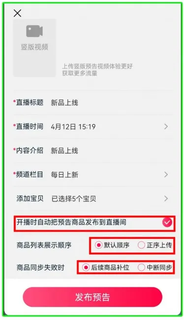 勾选【开播时自动把预告商品发布到直播间】后可以选择【商品列表展示顺序】、【商品同步失败时】注意::若未勾选,开播后需要手动推送商品进入宝贝口袋