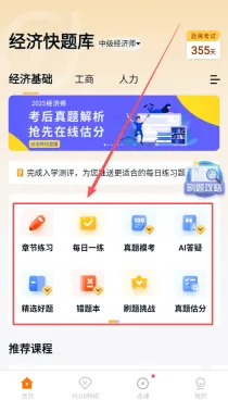 2、登录后进入主页,能看到中级经济师各科目入口和考试倒计时,先完成入学测评获取个性化推荐题目。