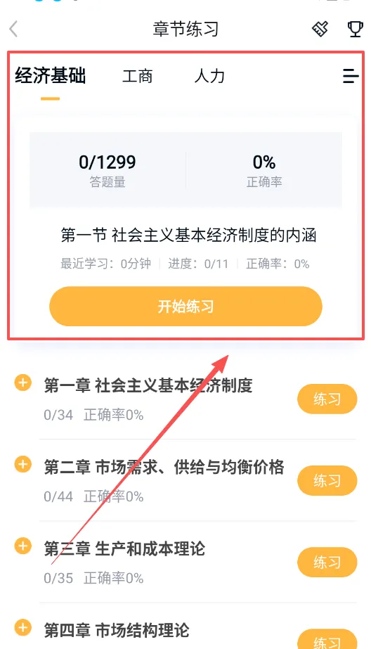3、想要系统刷题的话,就进入章节练习模块,点击开始练习即可做题,每章都有题目总量和当前进度显示。
