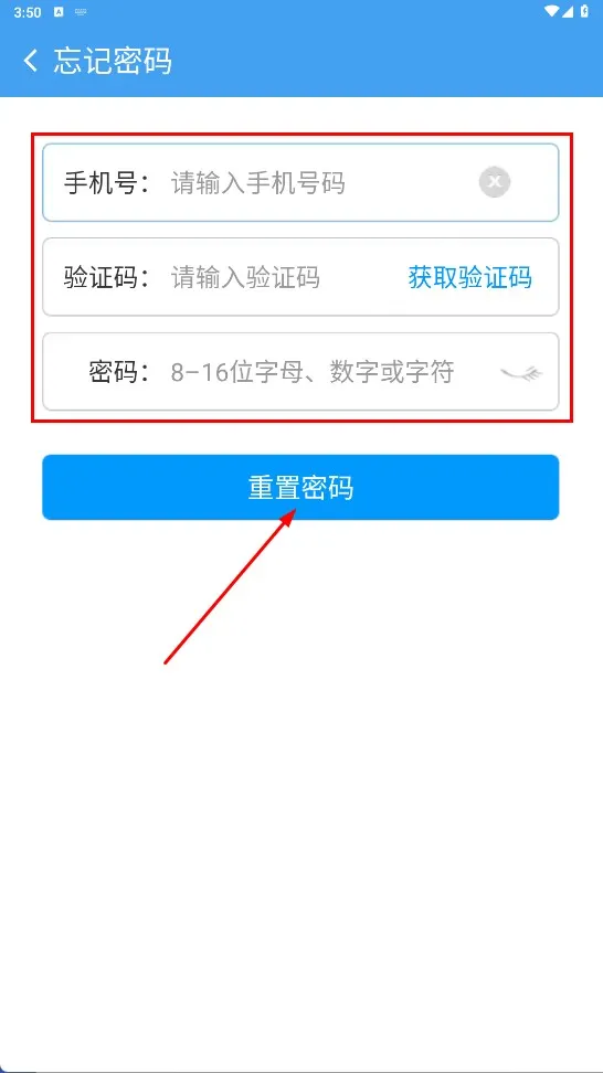 3、若忘记密码,进入忘记密码页面,输入手机号、验证码,设置新密码后点击【重置密码-功能按钮】完成密码重置。